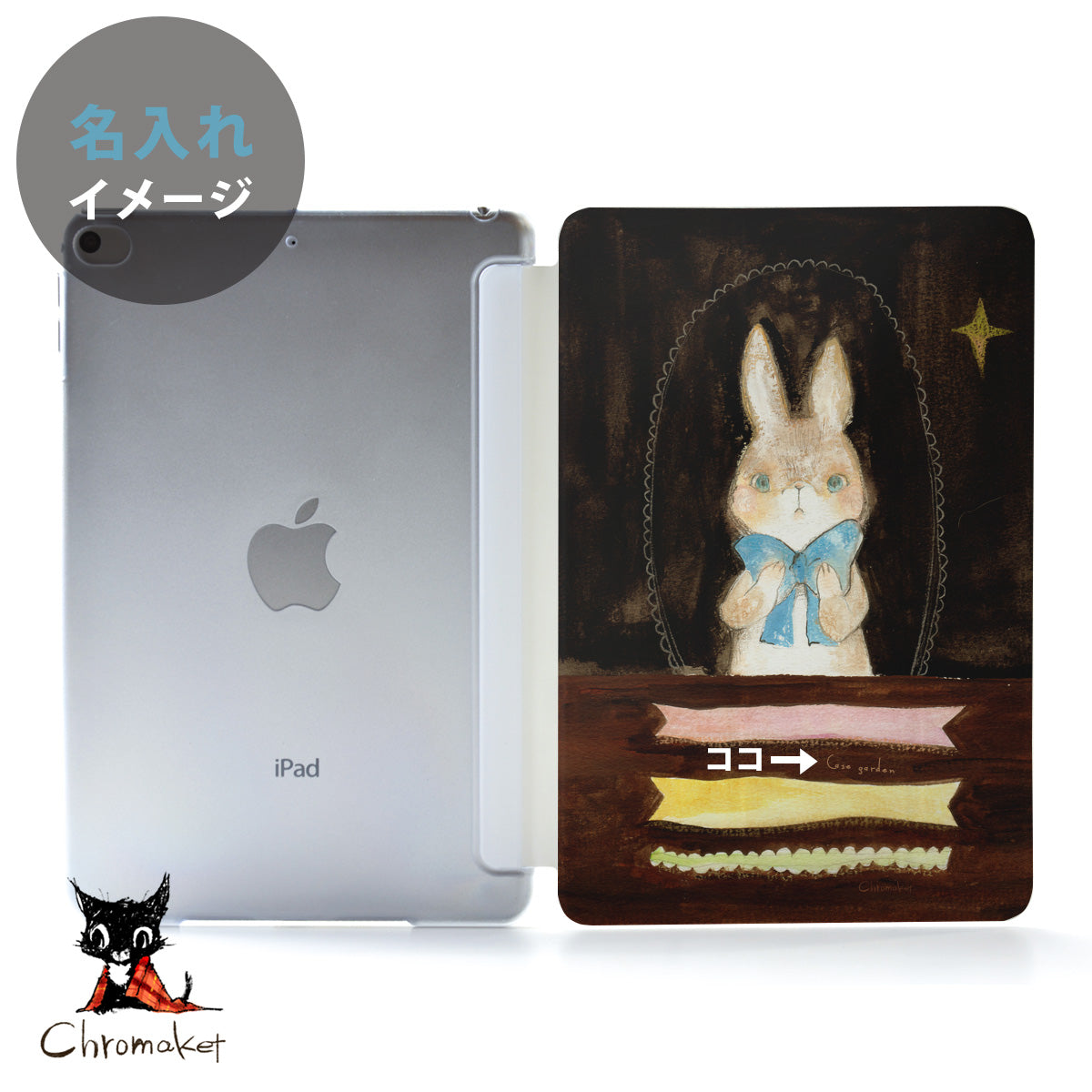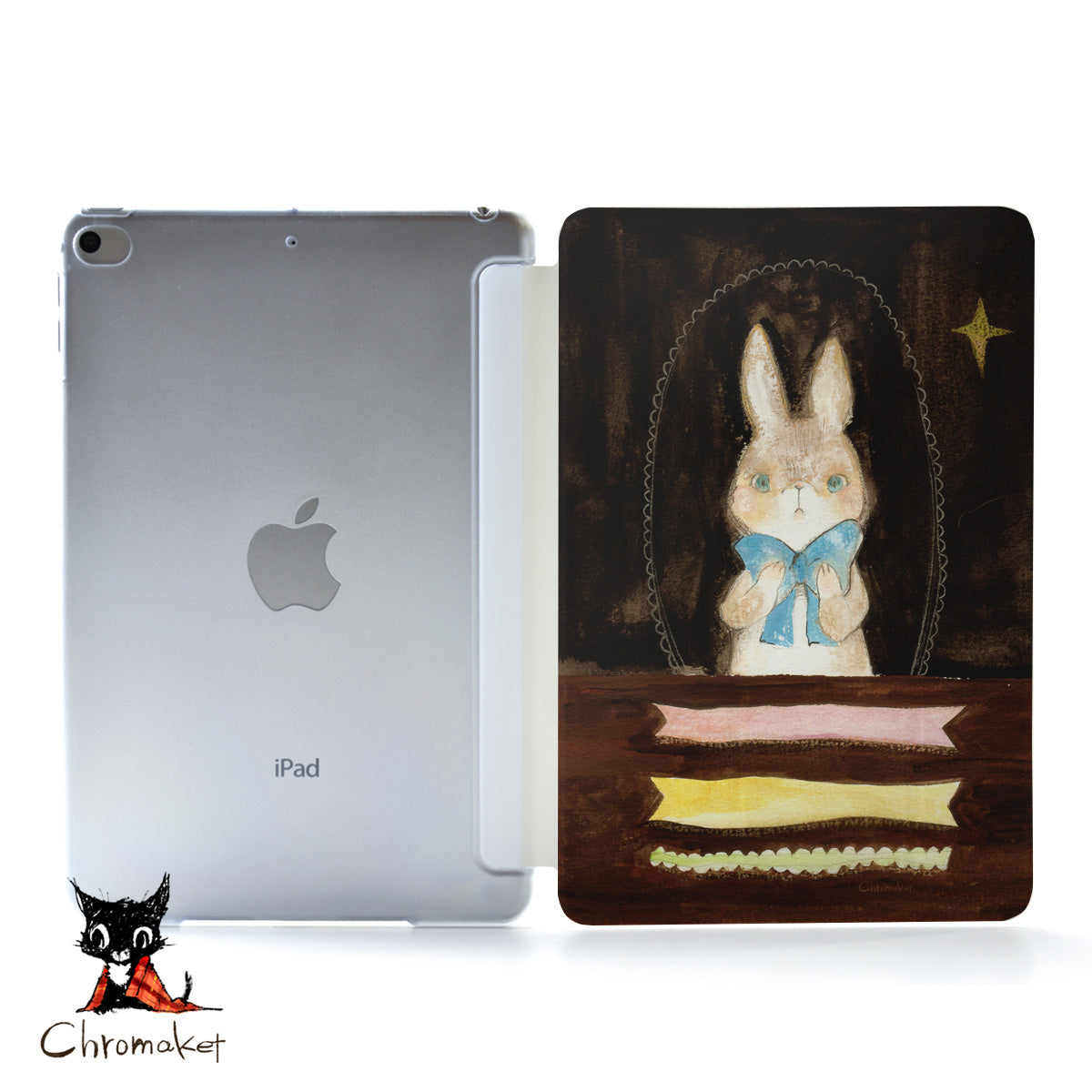 鏡の前でおめかし。今日のリボンはどれにしようかしら? きっとおしゃれなウサギさんなんでしょうね。ブルーの大きめリボンがよく似合っています。やわらかくそっと、傍に寄り添う色彩。かわいらしく印象的なイラストを描く。仁子デザインのiPadケース。