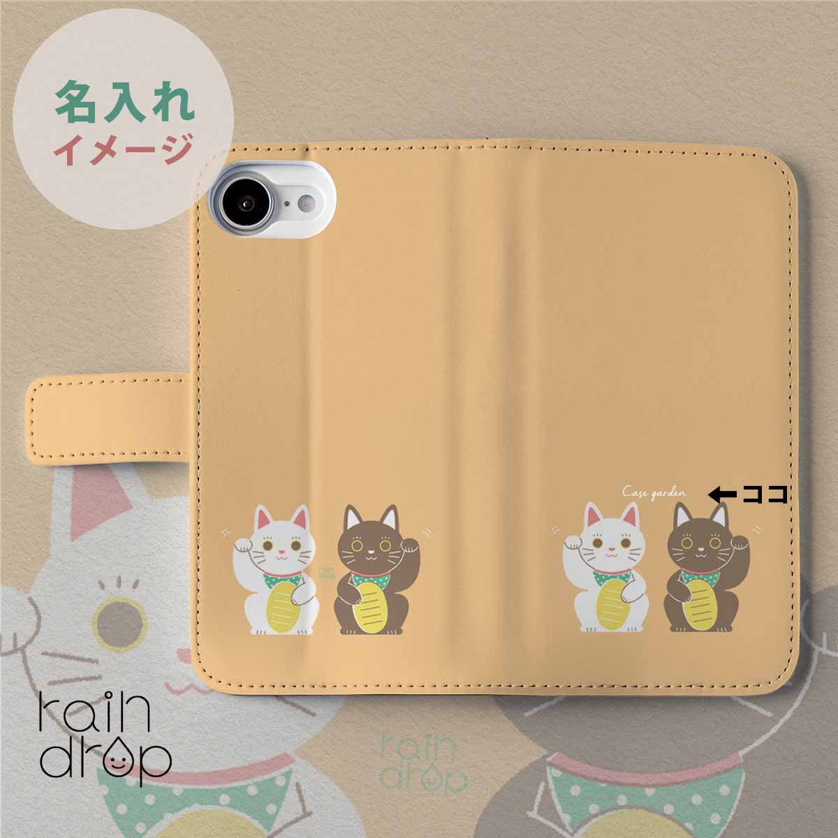 名入れ:ご注文の際にお選びください。手帳型スマホケースへの名入れ位置はお任せになります。名入れのイメージは画像にてご確認ください。